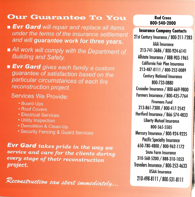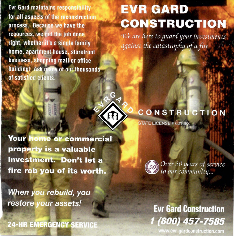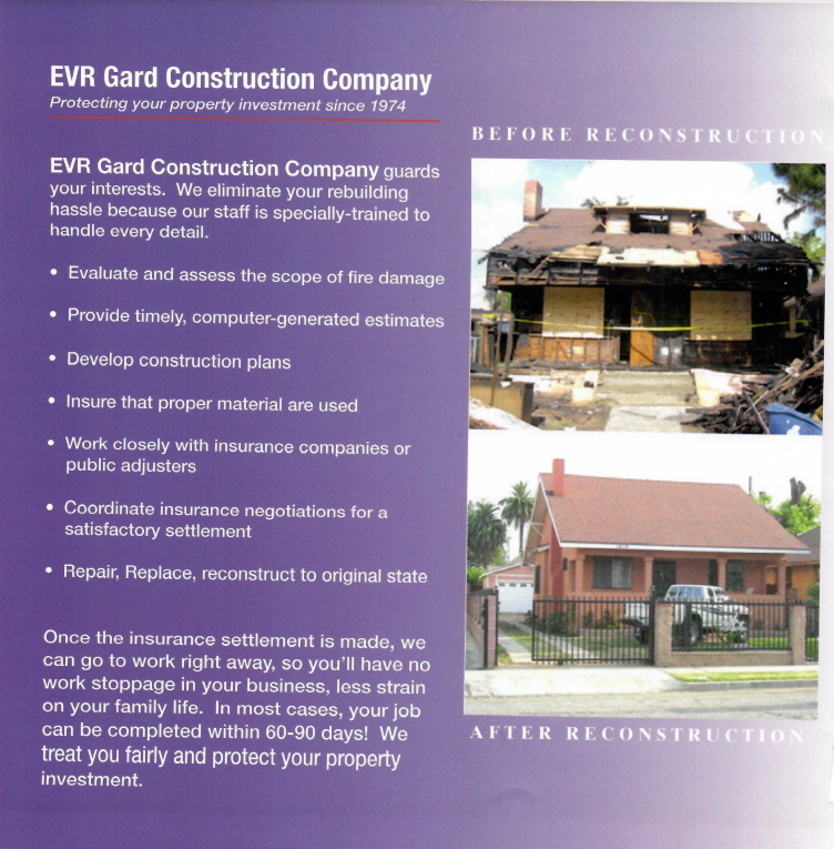 Evr-Gard is a licensed fire reconstruction contracting company, based in Culver City, California. We maintain responsibility for all aspects of the reconstruction process. Because we have the resources, we get the job done right, whether it's a single house, storefront business, shopping mall or office building! Ask one of our thousands of satisfied clients from five decades of operation.